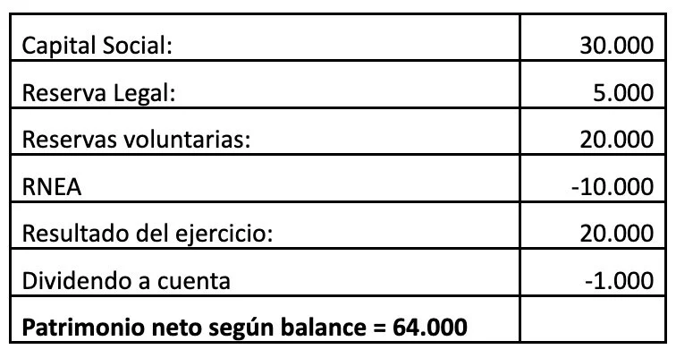 Patrimonio neto (artículos 28.2 y 3.1 de la RICAC 05-03-2019) = Patrimonio neto según balance + socios por aportaciones pendientes de exigir + nominal y prima de emisión de acciones consideradas pasivos financieros +/- ajustes por cambios de valor de operaciones de cobertura de efectivos – ajustes positivos de valoración de operaciones distintas – subvenciones, donaciones y legados = 64.000 + 0 + 0 +/- 0 - 0 – 0 = 64.000