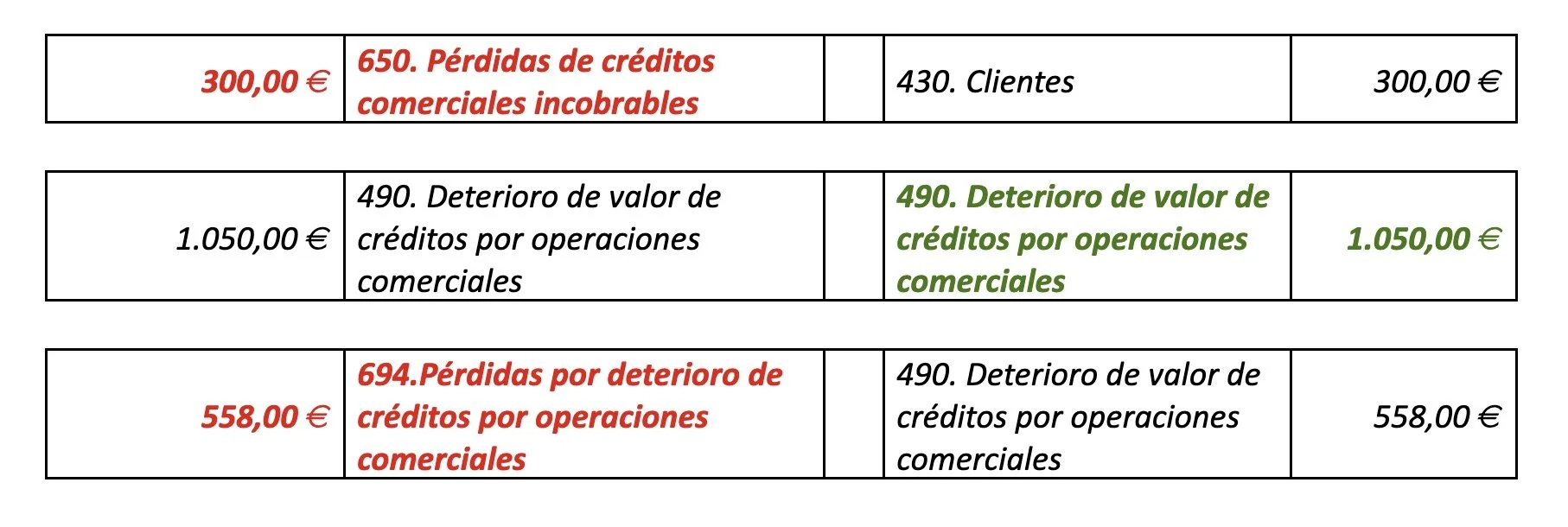 650. Pérdidas de créditos comerciales incobrables Pérdidas por deterioro en insolvencias firmes de clientes y deudores del grupo 4. Se cargará por el importe de las insolvencias firmes, con abono a cuentas de los subgrupos 43 y 44.